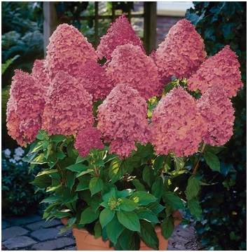 Такая метельчатая гортензия представляет собой кустарник, вырастающий до 2 м в высоту. У него жесткие листья темно-зеленого окраса с зубчатыми краями. У гортензии крупные метельчатые соцветия, похожие на свечу или пирамиду. Цветут они цветками с интересным окрасом.