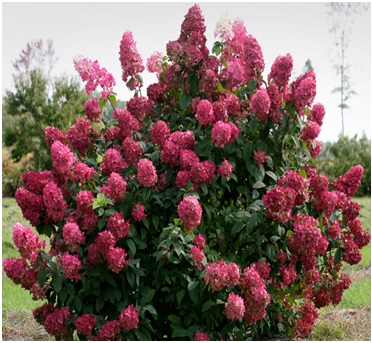 Разновидность гортензии «ВимсРед» – лиственный декоративно цветущий кустарник. Этот сорт отличается компактными размерами. Высота кустов не превышает 1,5 м, часто встречаются и более мелкие экземпляры. Растет сорт равномерно, поэтому с помощью формирующей обрезки гортензии легко придать шарообразную форму. Ветви растения имеют бордово-красный цвет. Они достаточно жесткие, чтобы куст не распадался во время цветения. Побеги не поникают под тяжестью соцветий и не ломаются. Листья растения удлиненные, темно-зеленого цвета. Осенью они меняют цвет, становясь серебристо-золотыми