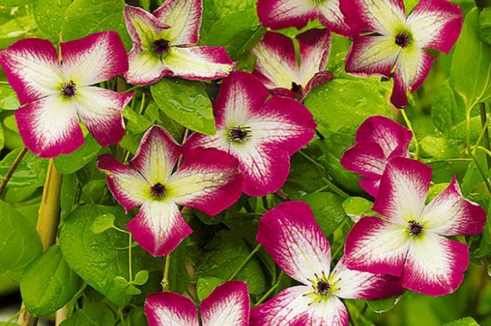 Клематис Tango (Танго) - интригующий сорт с двуцветными цветками, диаметром около 6 cм, состоящих из 4 лепестков, ярко-красных с белой полосой, на которой видно красное жилкование. Нижняя сторона лепестков светло-розовая. Середину цветка заполняют тычинки с бордовыми пыльниками на зелёных нитях и тёмно-коричневый пестик. Цветёт в конце июня-сентябрь. Высота растений: 2-3 м. Любит солнечные места, но защищённые от ветра. За опоры цепляется листовыми черешками. Подходит для посадки у беседок, ограждений, сетках, решётках и других садовых опор. Особенно красиво смотрится когда карабкается по натуральным опорам.