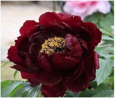 Черно-бордовые цветки полумахровые, крупные, диаметром 16-20 см. Устреммлены вверх. Листва крупная, светло-зелёная. Цветение средне-позднее, очень обильное.