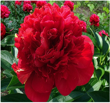 Пион красный (Red) — превосходен в ландшафтном оформлении как в группах, так и в качестве солирующего растения. Махровый, бомбовидный, красивой формы имеет драматический, темно-красный цвет с привлекательным центром, диаметр 16 см. Высокий куст 75-90 см с прочными стеблями и разрезной листвой. Красный пион Red лучше растёт на солнечных участках, однако цветёт дольше в полутени. Цветки хорошо сохраняют цвет при любых погодных условиях. Этот сорт пиона очень устойчивк поражению вредителями и очень быстро нарастает. Пионы хорошо растут на любой почве, особенно на богатой питательными веществами. Они почти не требуют ухода, при этом очень морозостойки