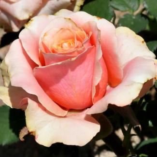 Чайно-гибридная роза. Сверкающая роза с сильным приятным ароматом. Нежно-розовый крупный цветок словно светится в лучах солнца. Крепкая нарядная листва отлично противостоит болезням. Повторное цветение. Диаметр цветка 12 см, высота 80-100 см. Сорт зимостойкий.
