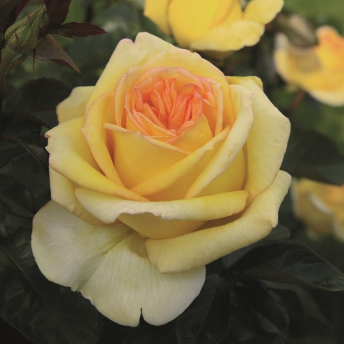 Роза чайно-гибридная Голден Тауэр. Этот сорт характеризуется очень длинными побегами и невероятно крупными, диаметром 12-14 см, цветками. Обладают великолепным ароматом. Окраска цветков теплая, от кремовой до темно-желтой, в зависимости от погодных условий может появляться красноватая кайма.